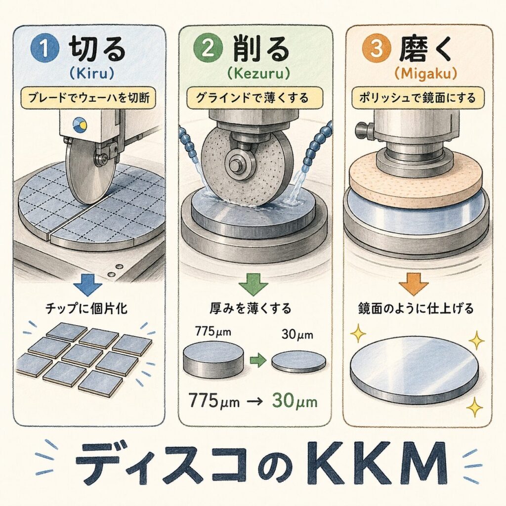 現在のディスコが手がけているのは、半導体製造における「KKM」と呼ばれる3つの加工プロセスです。ディスコ自身がこの頭文字を使って事業を説明しています。