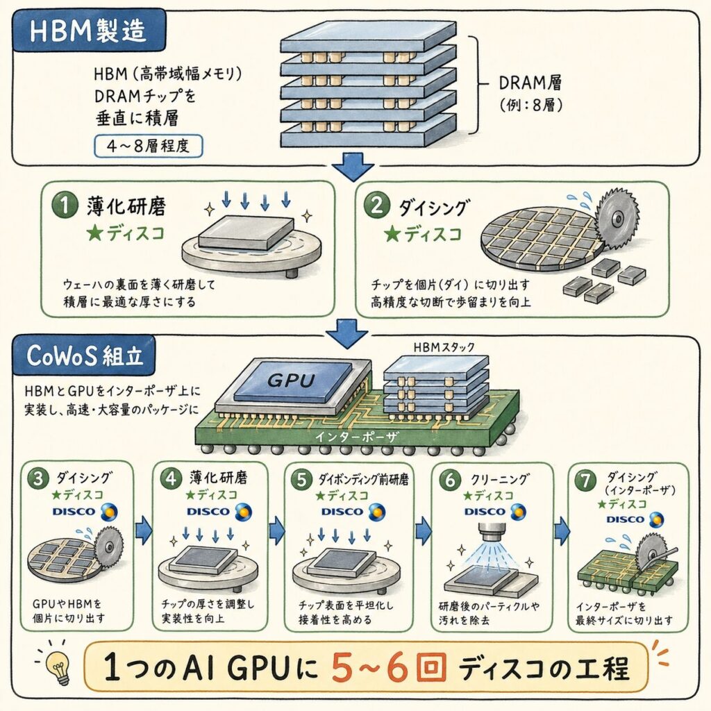 ディスコの装置は、AI半導体の製造工程で「複数回」登場するのが重要です。GPUダイの加工でも、HBMの加工でも、インターポーザーの加工でも、パッケージの切断でも──すべてにディスコの「切る・削る・磨く」が必要。1つのAI GPUパッケージを作るために、ディスコの装置が少なくとも5〜6工程で使われる構造です。