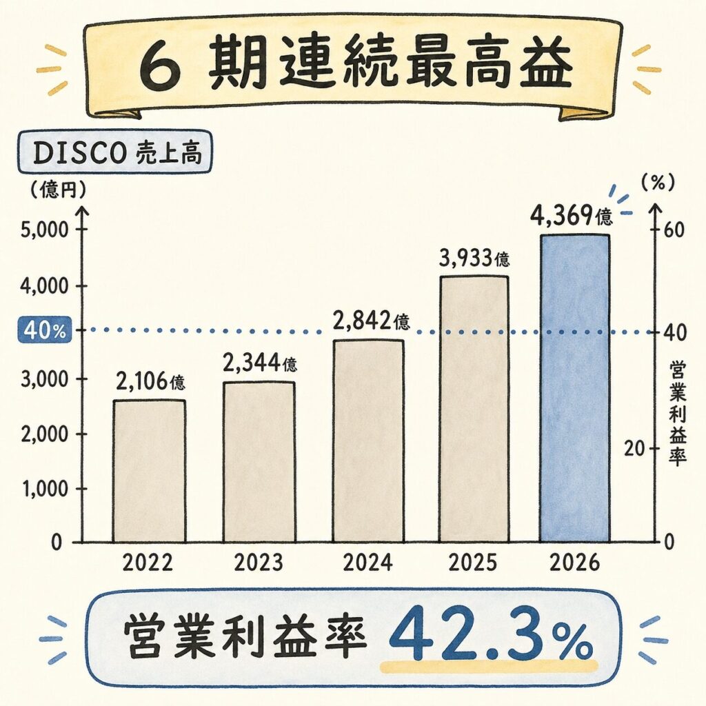 2026年4月22日に発表された2026年3月期(2025年4月〜2026年3月)の連結決算は、売上高・各利益ともに6期連続で過去最高を更新しました(出典:ディスコ決算短信)。
