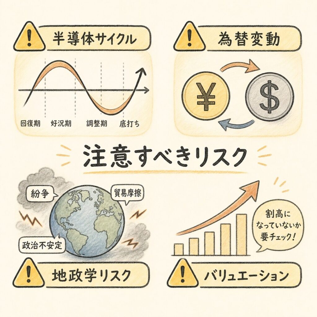⑦ リスク:半導体サイクル・為替変動・地政学リスク・バリュエーションの高さ。