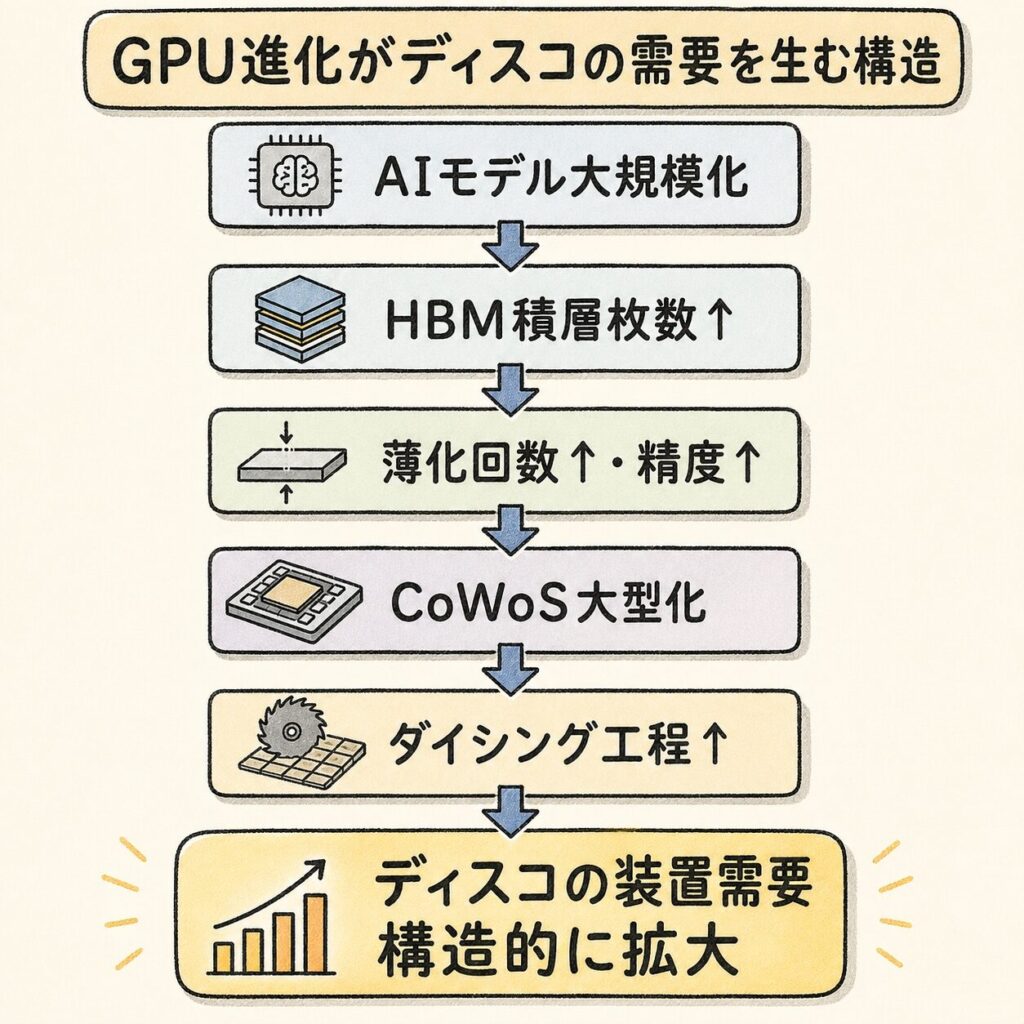 ディスコの成長は「GPU世代が1つ進むたびに、ディスコの装置が使われる回数と精度要求が増える」という構造的な関係に支えられています。NVIDIAのGPU世代がA100→H100→B200→Vera Rubinと進むたびに、HBMの積層枚数が増え、CoWoSのパッケージが大型化し、ディスコの装置の需要が構造的に拡大する──これが「AIに強い」の本質です。