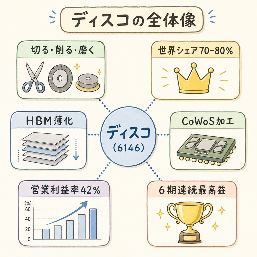 結局こういうことです。ディスコは「半導体を切って、薄くして、磨く」会社です。一見地味ですが、HBMもCoWoSもハイブリッドボンディングも──AI半導体の先端技術が進化するたびに、「切る・削る・磨く」の回数と精度要求が増える構造になっています。NVIDIAのGPUが進化するほど、ディスコの装置が必要になる。これが、ディスコの研磨・切断技術がHBM・CoWoSの歩留まりを決める理由です。