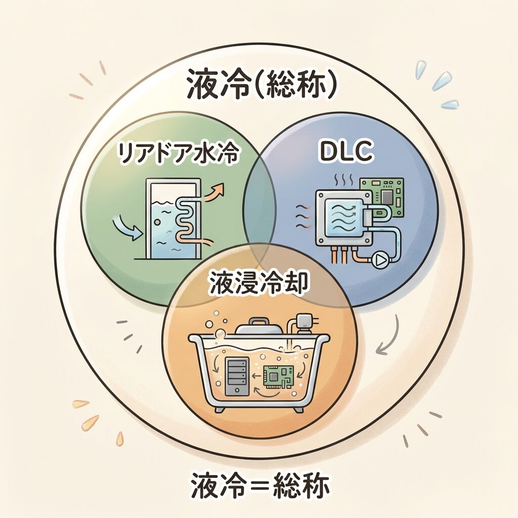 ① 液冷=総称:液体を使う冷却技術の総称。「水冷」はほぼ同義の日本語表現。