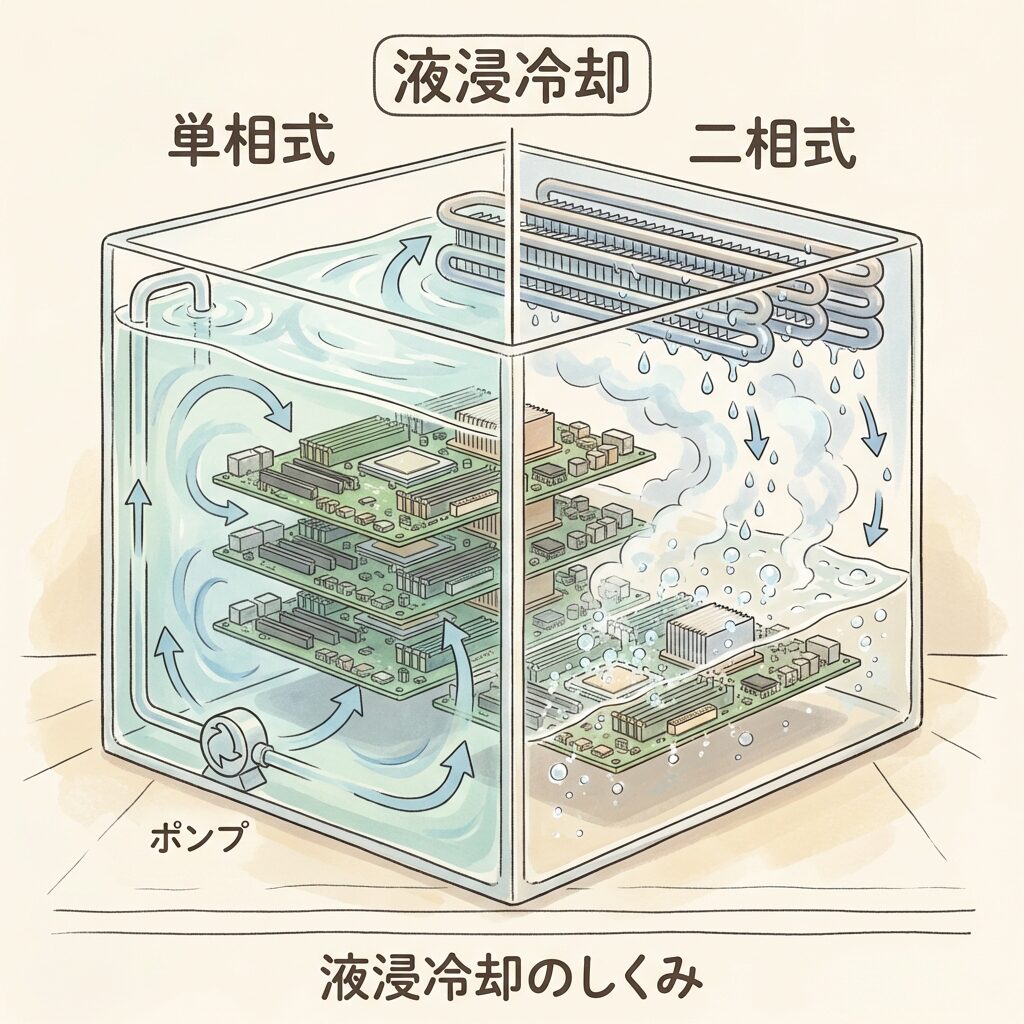 液浸冷却(Immersion Cooling):基板ごと冷却液に沈める方式。液冷の一種。