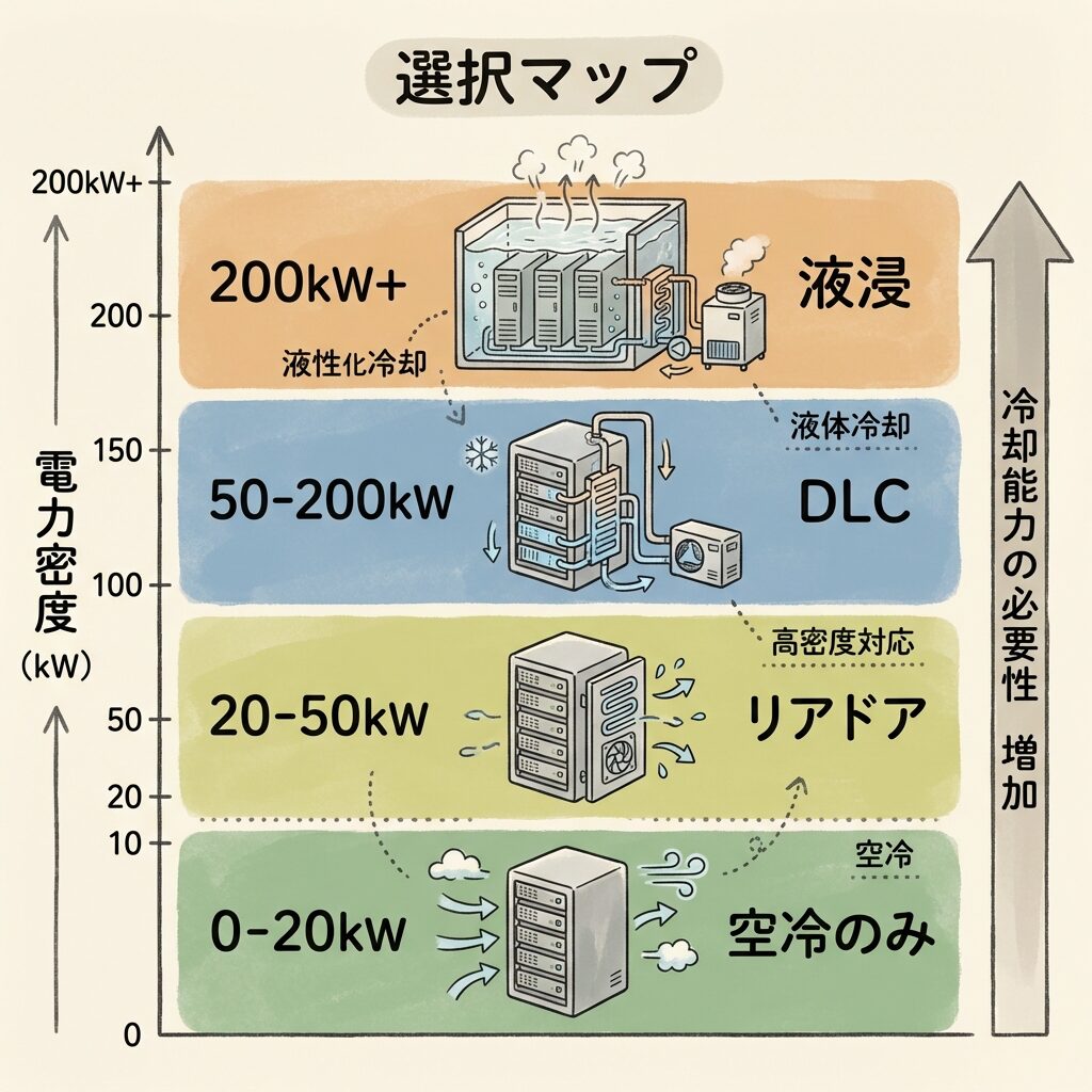 ⑥ 選び方はラック電力密度で決まる:20kW以下=空冷、20〜50kW=リアドア、50〜200kW=DLC、200kW超=液浸冷却。