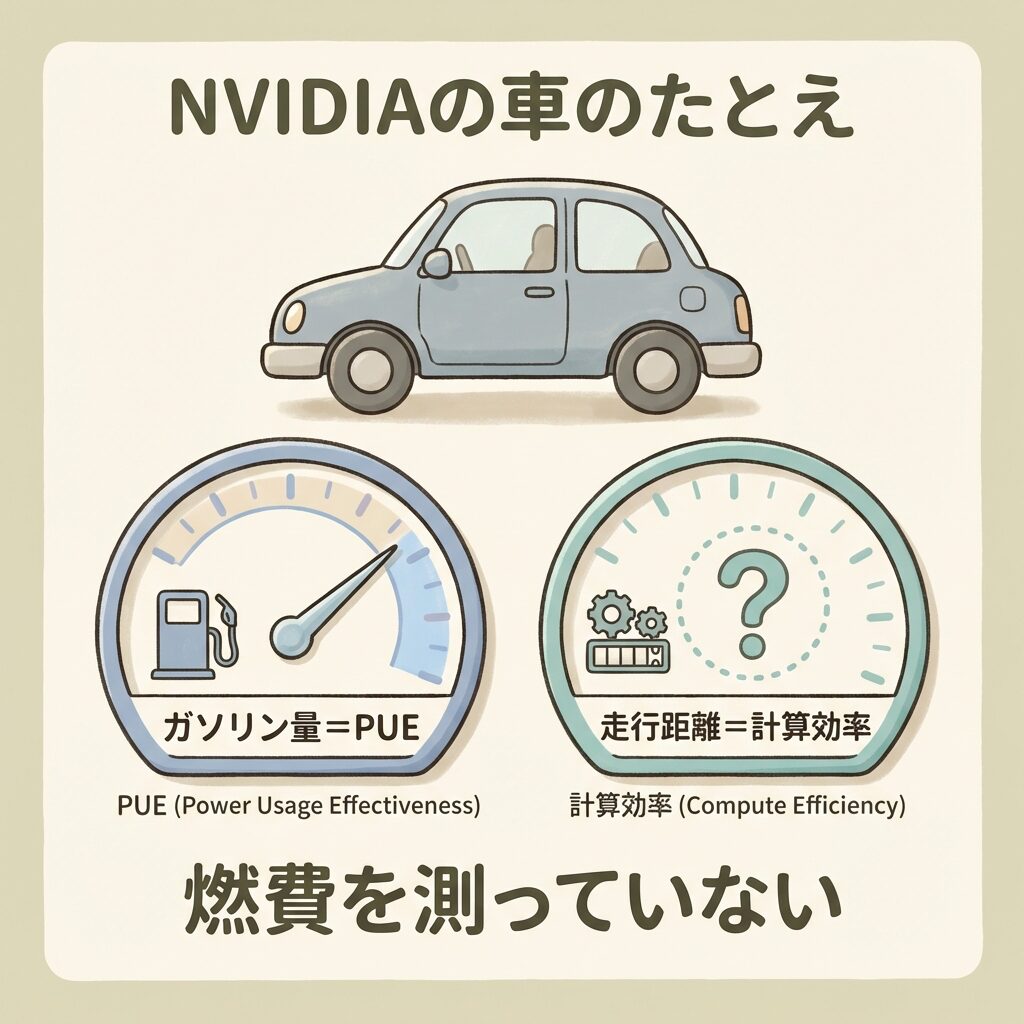 NVIDIAはPUEの限界を、自動車の例えで明快に説明しています。「PUEはエンジンが使ったガソリンの量を測っているだけで、車がどこまで走ったかは測っていない」(出典:NVIDIA Blog)。