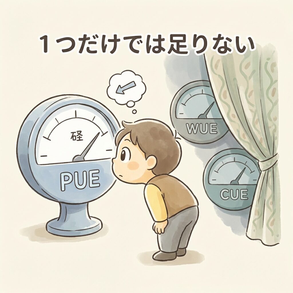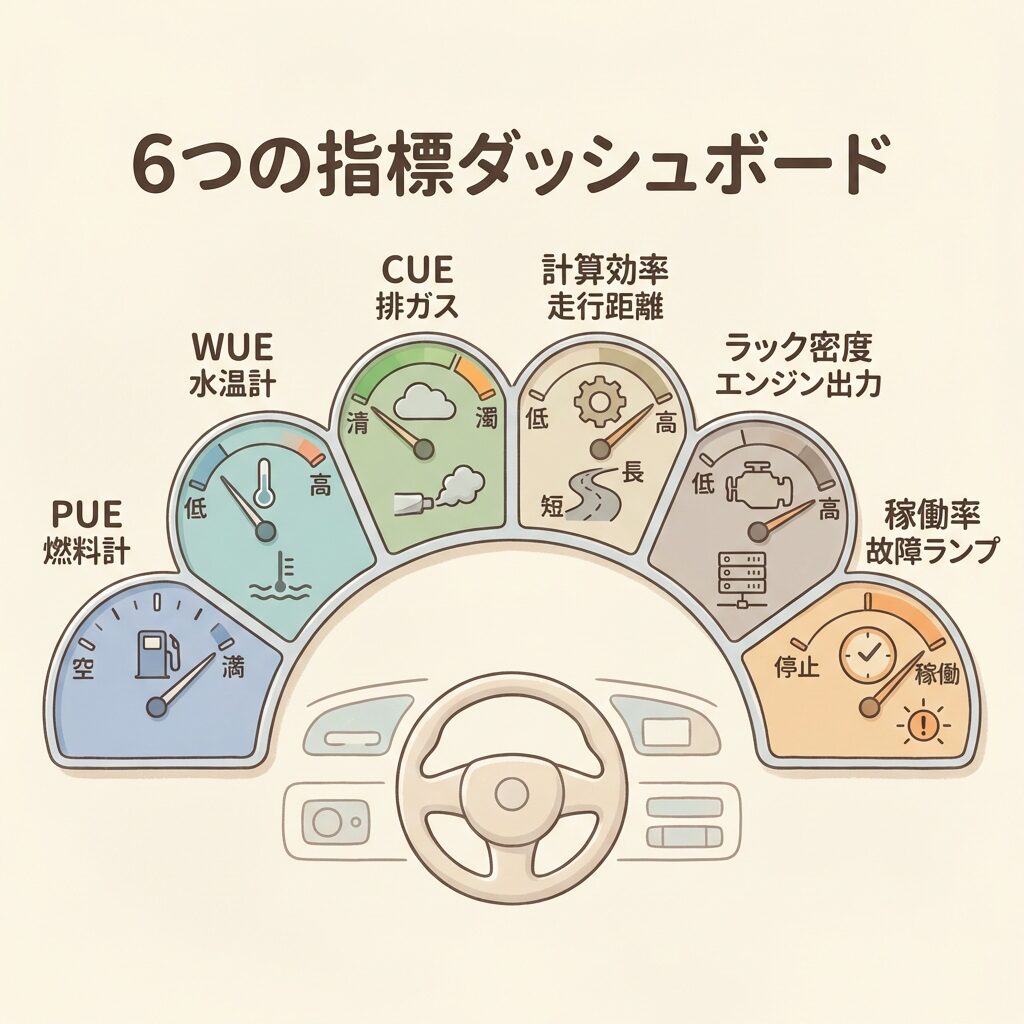データセンターの指標は「車のダッシュボード」と同じです。PUEは「燃料計」。大事だけど、それだけでは運転できません。WUEは「水温計」、CUEは「排ガスメーター」、計算効率は「走行距離計」、ラック電力密度は「エンジン出力」、稼働率は「故障ランプ」。すべてを合わせて初めて、車の状態が正確にわかるのです。