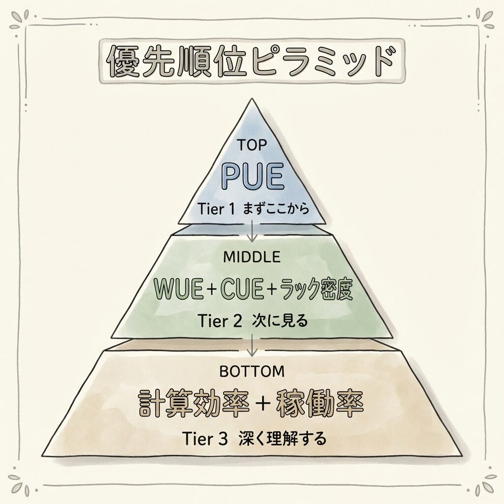 ④ 優先順位:Tier 1 → PUE。Tier 2 → WUE+CUE+ラック電力密度。Tier 3 → 計算効率+稼働率。3段階で段階的に理解する。