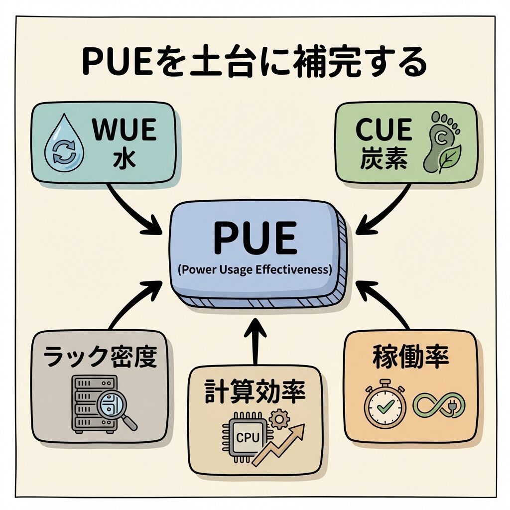 PUEは「死んだ指標」ではありません。今も基本であり、最初に見るべき指標です。ただし、AI時代にはPUEだけでは「見えない部分」が大きくなりすぎた。だから補完する指標が必要になった──という構造です。