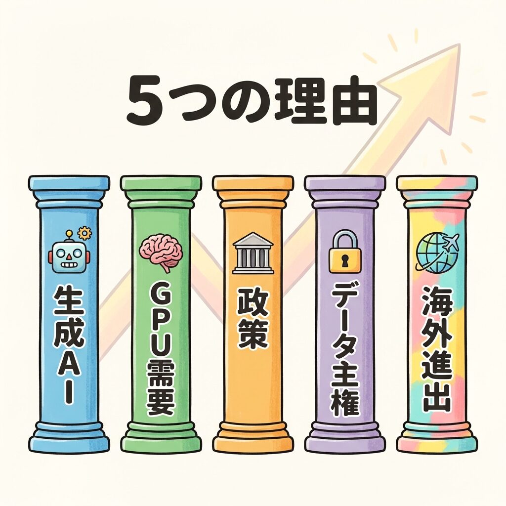 ① 5つの増加理由:生成AIの爆発的普及、GPU需要の急拡大、政府のインフラ政策、データ主権への意識、海外ハイパースケーラーの日本進出。