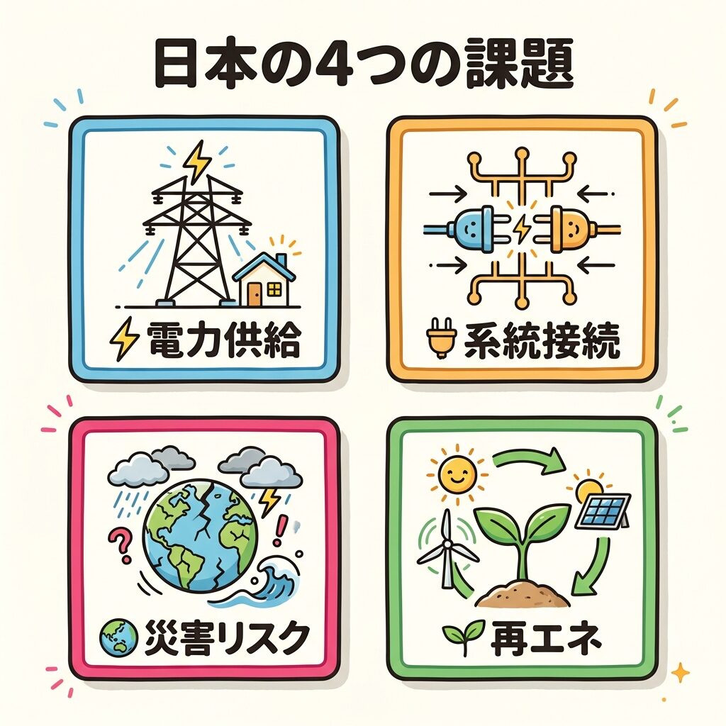 - 電力・系統接続・再エネ・災害リスクという日本固有の課題