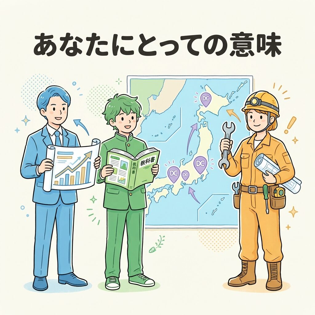 | 「データセンターは東京に作ればいい」 | 東京圏は系統接続・用地不足・災害リスクの三重苦。政府は北海道・九州を第三・第四の中核拠点として整備促進中。 |