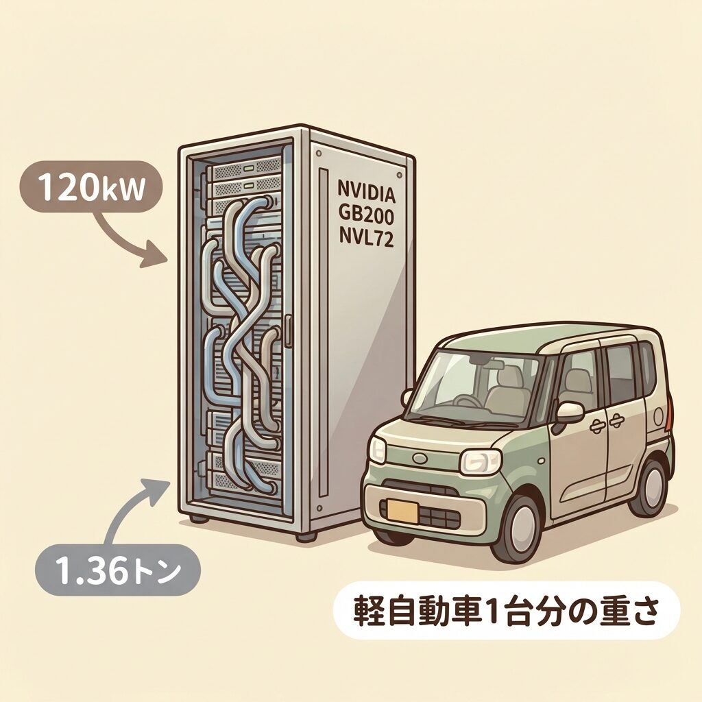 1本のラックで120kW、重さ1.36トン。これが数百〜数千本並ぶのがAIデータセンターです。「なぜデータセンターの設計が根本から変わるのか」──この数字を見れば、答えは明らかですよね。
