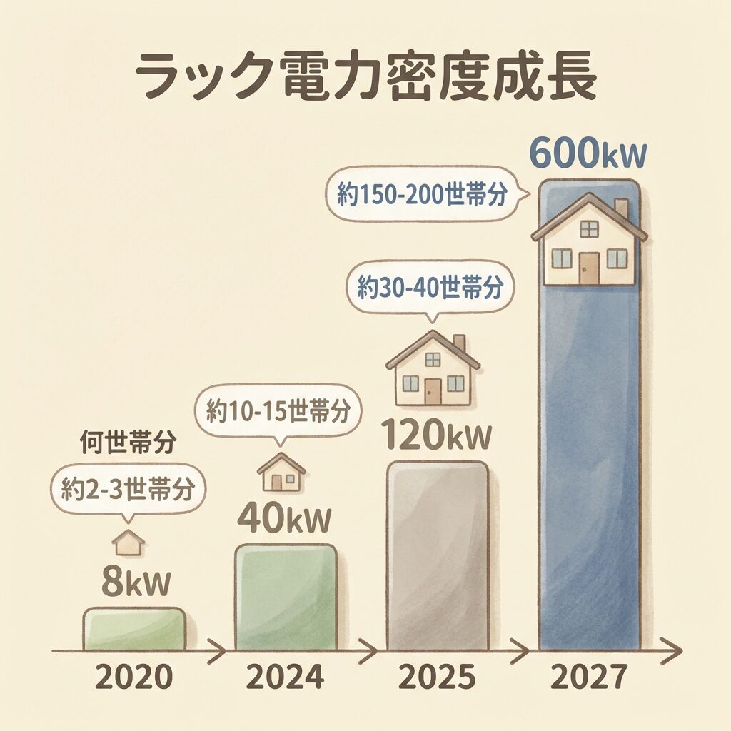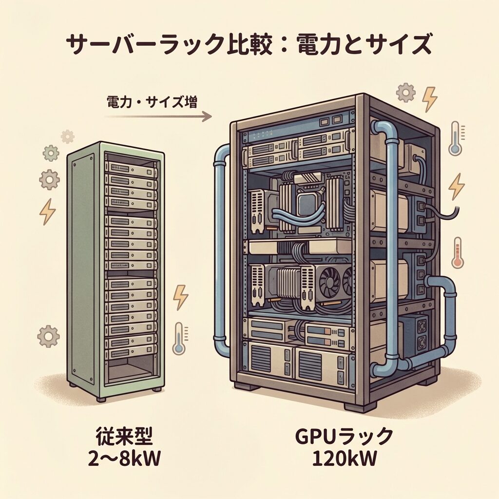 ③ 従来ラックとの差:電力が10〜60倍(2〜8kVA → 20〜120kW)、重量が3〜6倍、冷却方式が空冷から液冷へ。桁が違う。
