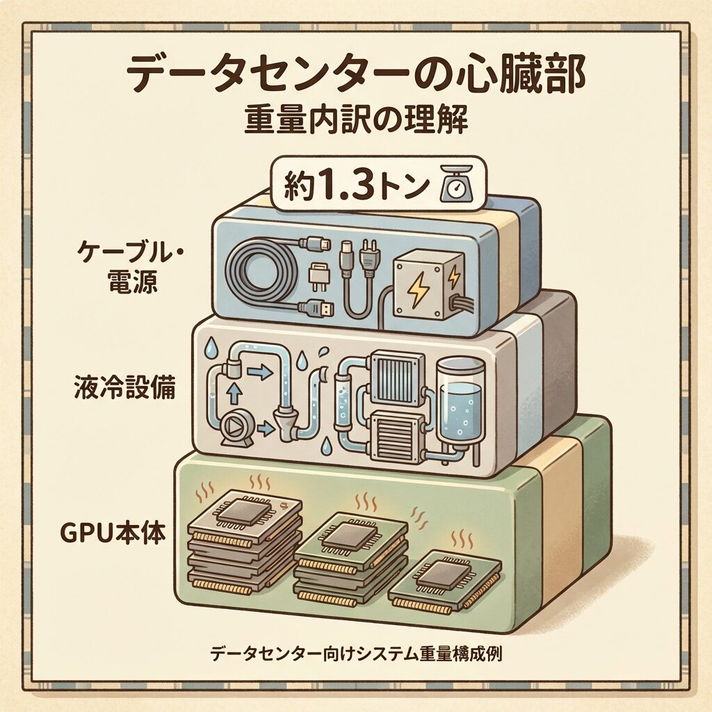 1. ⚖️ 重量の正体 ── GPU本体 + 液冷設備 + ケーブル