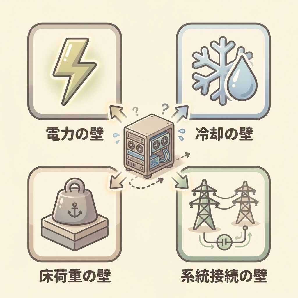 ここが、この記事で最も重要なセクションです。「GPUラックが重い・熱い・電気を食う」ことはわかった。では、なぜ既存のデータセンターを改修するだけでは対応できないのか。4つの壁を見ていきましょう。