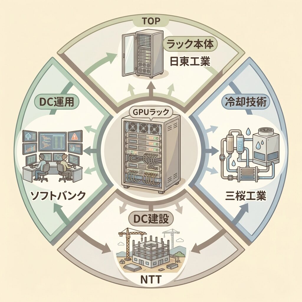 GPUラックの話はNVIDIAなど海外企業の名前ばかり出てきますが、実は日本企業もこの変化の当事者です。投資家・学生それぞれの視点で知っておくべき企業を、役割ごとに整理しました。