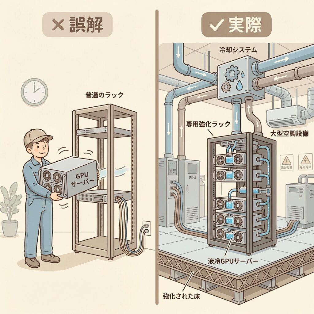 ここで重要なのは、「住人」が変われば「部屋」も「マンション」も「団地」も設計し直す必要があるということ。従来のCPUという「おとなしい住人」から、GPUという「電気を大量に使い、猛烈に暖房を焚く住人」に入れ替わったことで、ラック=マンションの電力配線も、空調も、床の耐荷重も、すべてが足りなくなっているのです。