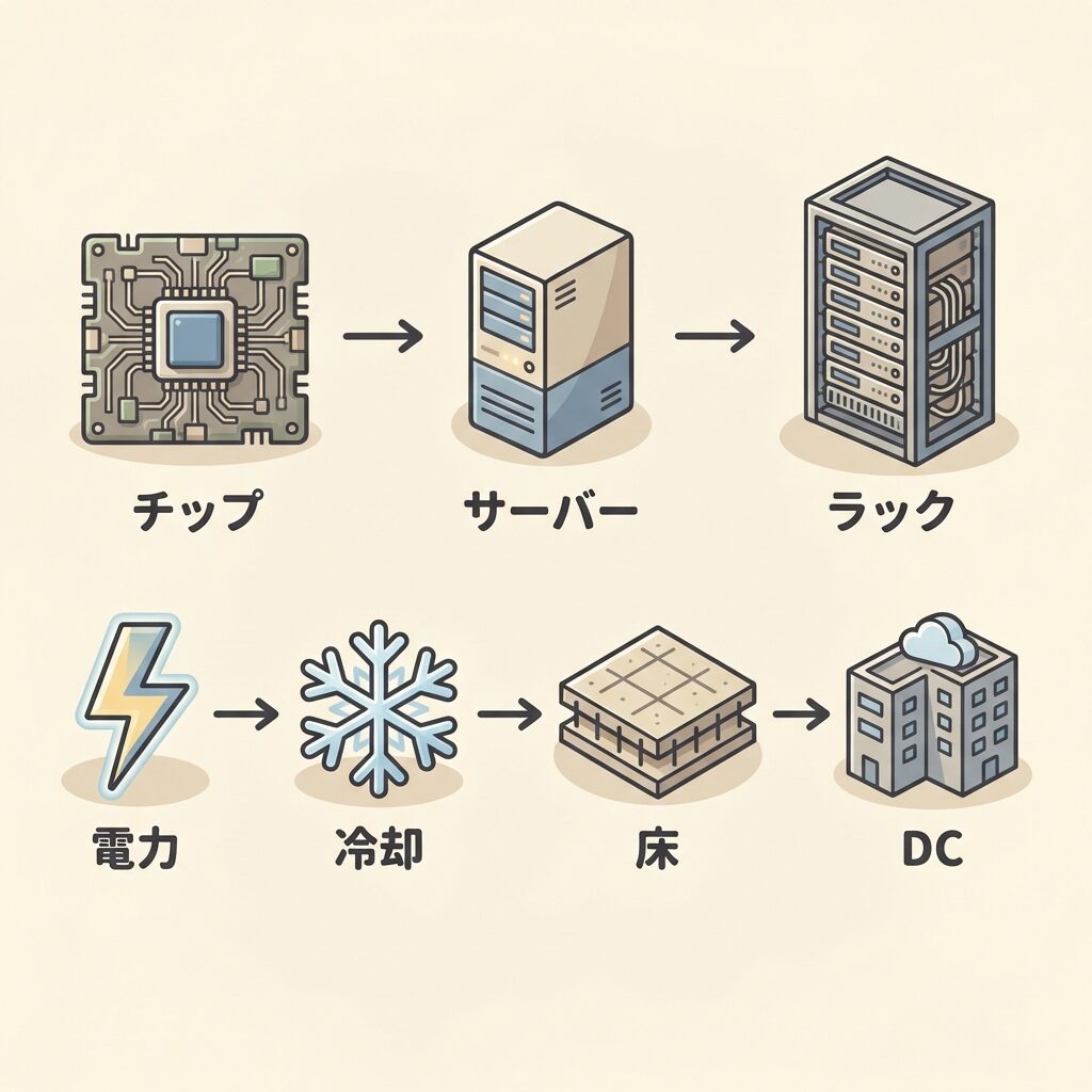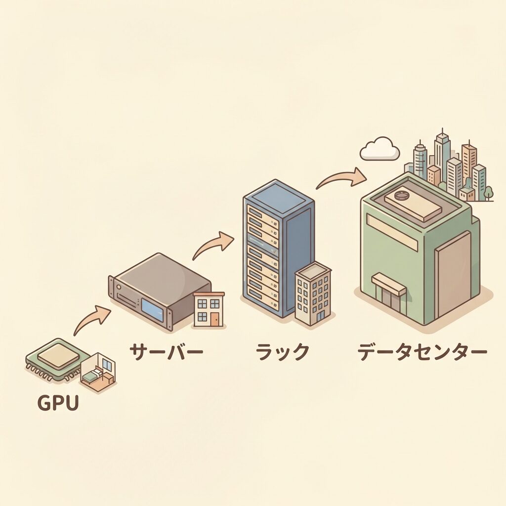 GPUという「住人」がサーバーという「部屋」に入り、そのサーバーがラックという「1棟のマンション」に積み上げられ、ラックが何百本も並んだものがデータセンターという「団地全体」です。