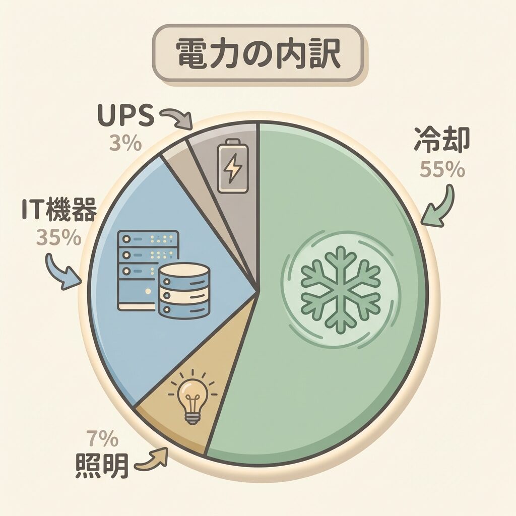 ここで「データセンター全体の消費電力」には、サーバーなどのIT機器に加えて、冷却装置(空調・液冷)、照明、セキュリティシステム、UPS(無停電電源装置)のロスなど、施設を運営するためのすべての電力が含まれます。一方、「IT機器の消費電力」は、サーバー・ストレージ・ネットワーク機器など、実際にデータ処理を行っている機器だけの電力です。