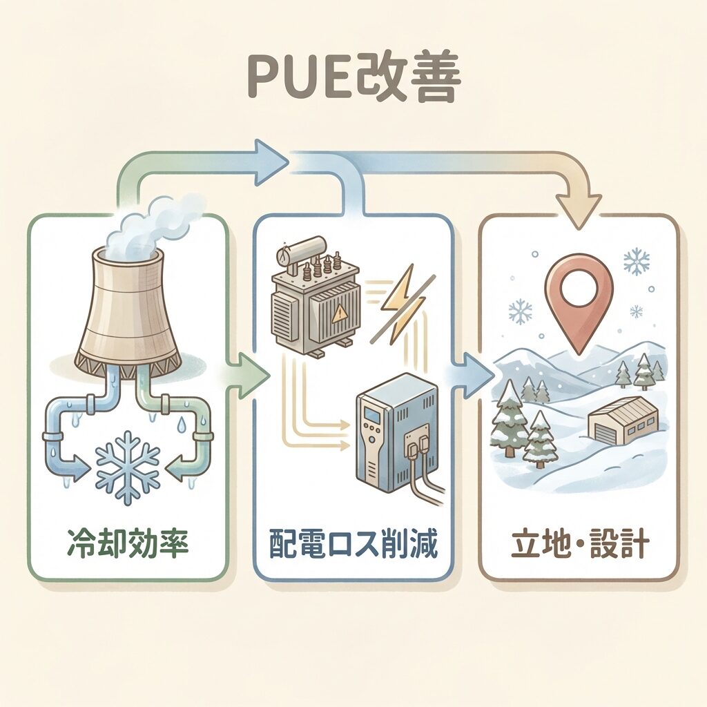 PUEの計算式を思い出してください。PUEを下げる(=改善する)には、分子(全体の電力)を小さくするか、分母(IT機器の電力)の比率を高める必要があります。具体的には3つのアプローチがあります。