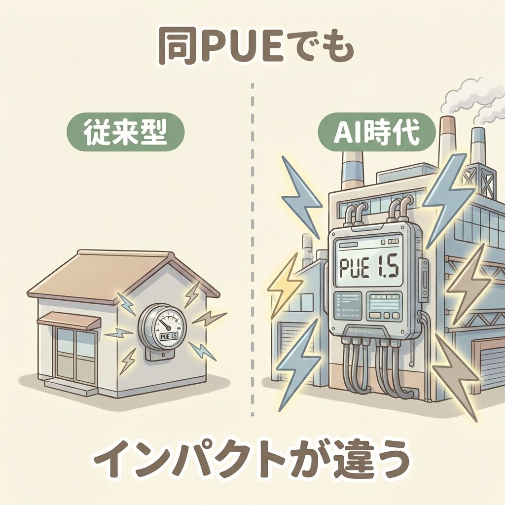 PUEは「IT機器以外のオーバーヘッドがどれだけ少ないか」を測る指標であり、IT機器自体が電力を効率よく使っているかは見えません。極端な例ですが、古いサーバーが大量の電力を消費しながらほとんど何もしていなくても、冷却効率が良ければPUEは良い数字になってしまいます(出典:環境省 IT機器グリーン化評価指標)。