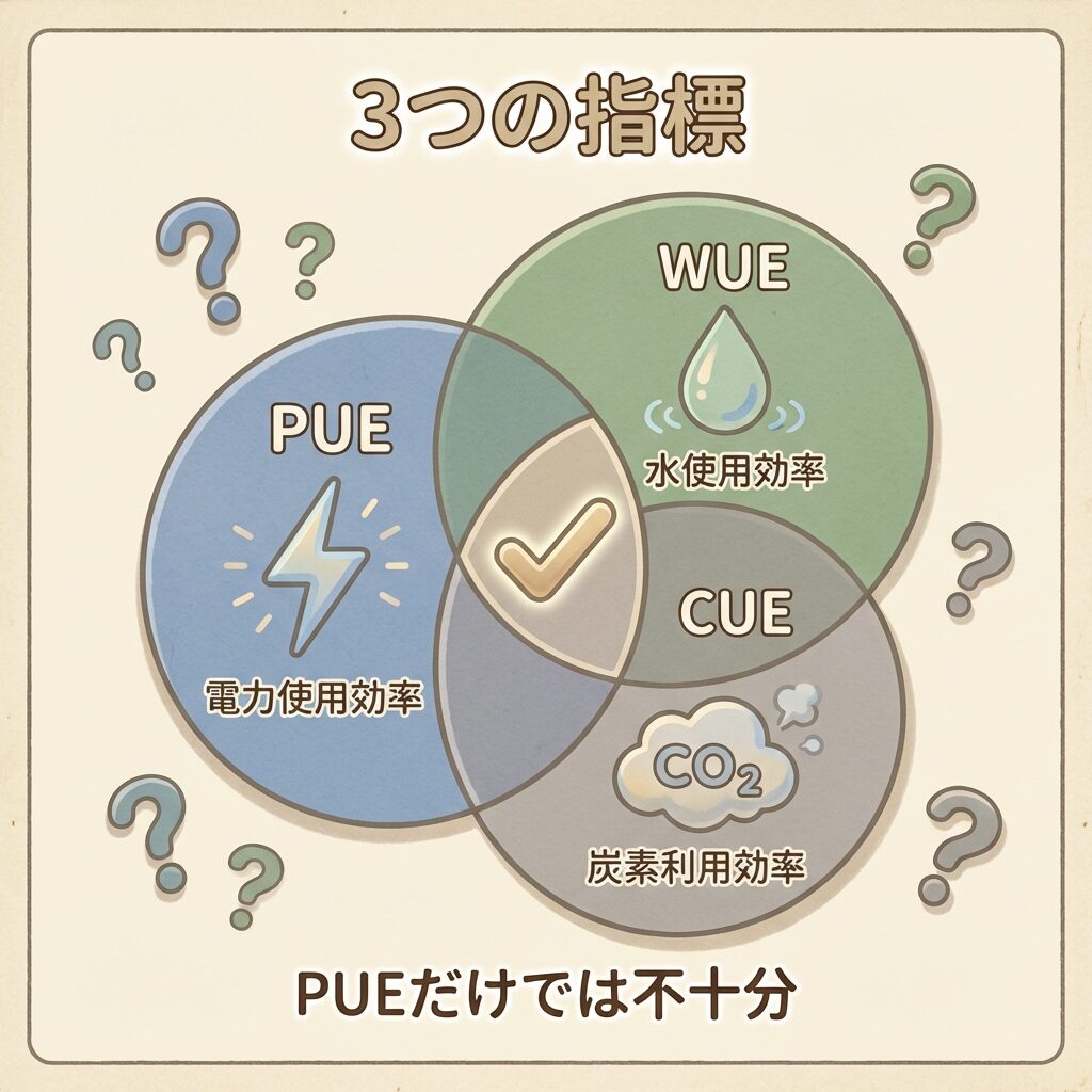 - PUEだけでは語れない理由と補完指標(WUE・CUE)
