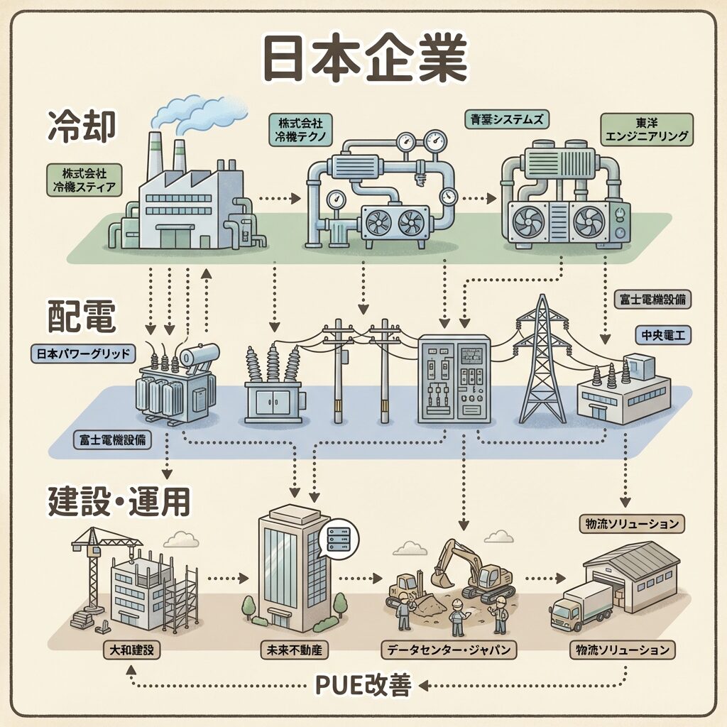 PUE改善の本質は「冷却効率の向上」と「配電ロスの削減」です。この2つの領域で技術力を持つ日本企業を、役割ごとに整理しました。