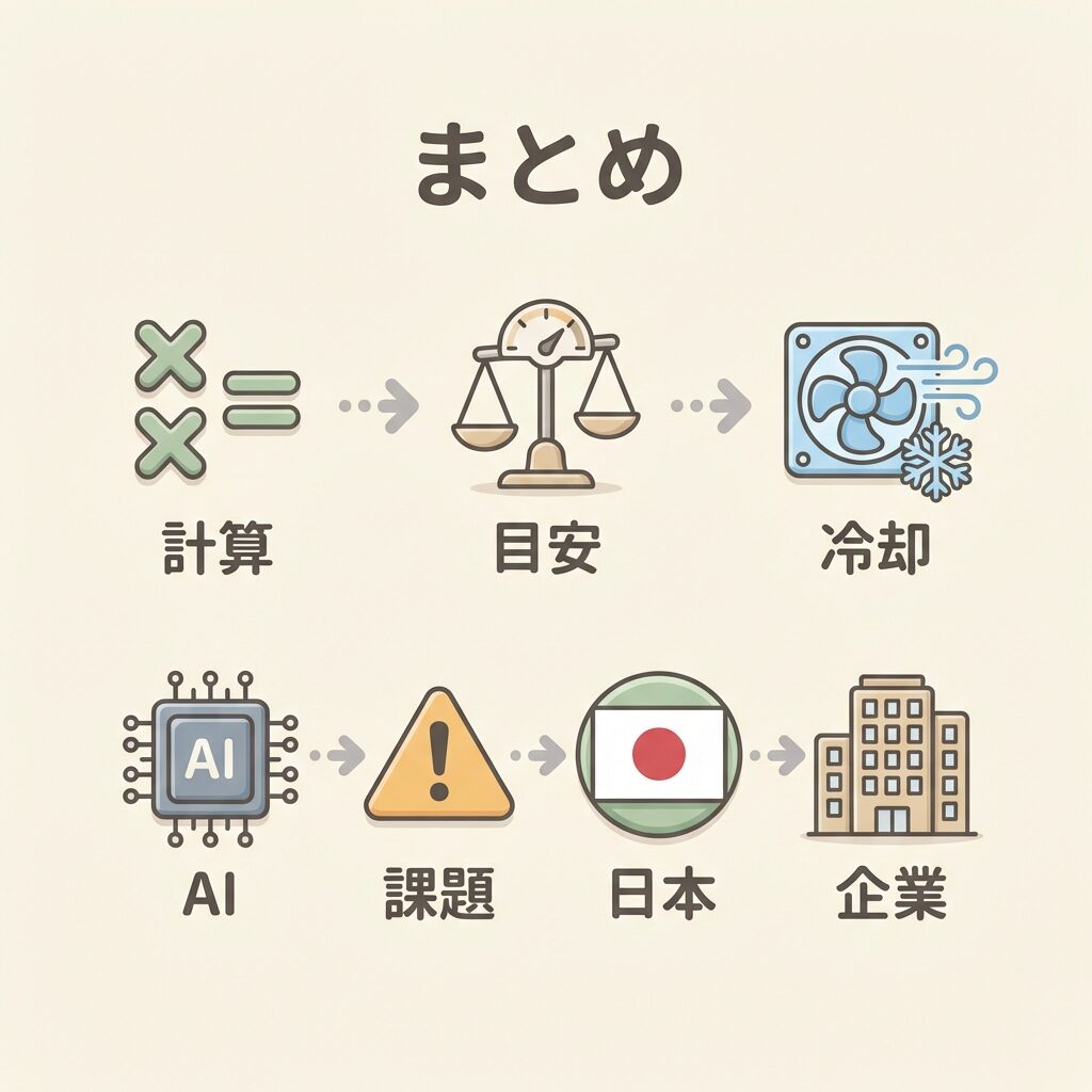 結局こういうことです。PUEとは「データセンターが電力をどれだけムダなく使えているか」を測る指標です。AI時代にGPUの消費電力が爆増したことで、PUEの「小さな差」が意味するコストと環境負荷が桁違いに大きくなりました。PUEは電力効率の「入口」であり、ここを押さえることでAIインフラの構造全体が見えてくるのです。