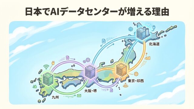 日本でAIデータセンターが急増する背景を図解で整理。生成AI普及・GPU需要・東京集中と地方分散・電力課題・再エネ活用まで、初心者が全体像をつかめる構成です。