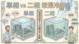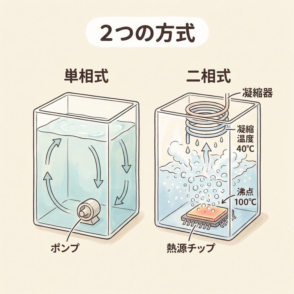 単相式は「ぬるま湯のお風呂」──お湯が温まったら配管で冷やして戻す、シンプルな仕組み。二相式は「沸騰するフットバス」──液体が沸騰する力で熱を奪い、蒸気が天井で冷えて水滴として戻る。二相式のほうが冷却パワーは上ですが、「密閉」「フッ素系冷却液」「凝縮器」が必要になるため、コストと複雑さが段違いです。