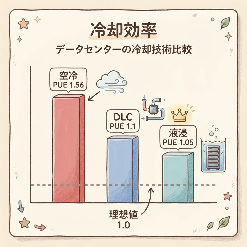 ③ 冷却効率は最高:KDDI実証でPUE 1.05(冷却電力94%削減)を達成。DLC(1.03〜1.15)をさらに上回る。