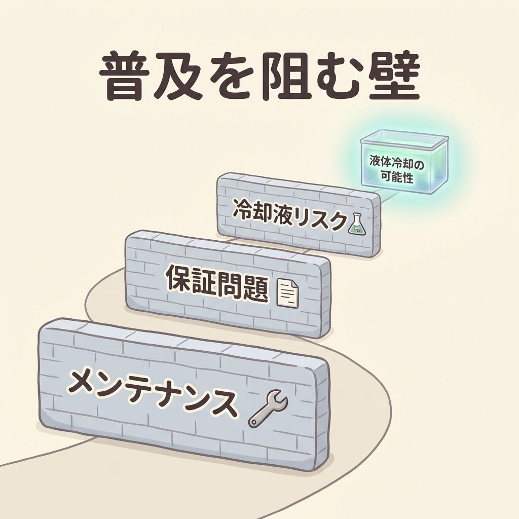 富士経済は2025年を「液冷元年」と呼んでいますが、その「液冷」の主役はDLC(コールドプレート方式)です。液浸冷却が主流になるためには、3つの壁が解消される必要があり、業界の見方では2028〜2030年頃に本格普及が始まる可能性があるとされています。