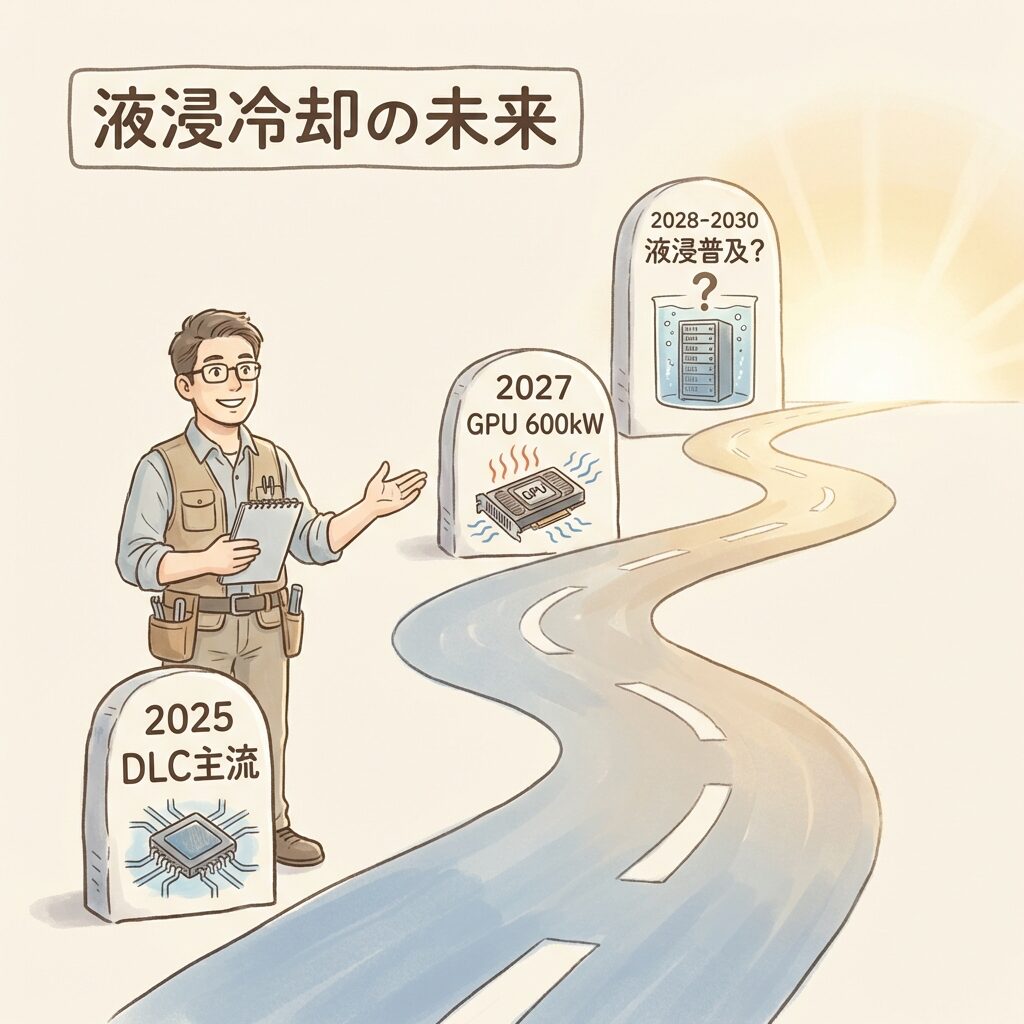 投資家:液浸冷却は「今すぐ」の投資テーマではなく、「2028年以降」の成長テーマです。ただし、冷却液メーカー(ENEOS等)、液浸冷却タンクメーカー(GRC、Submer、国内のQuantum Mesh等)、PFAS代替技術を持つ化学メーカーは、今から仕込む価値のある領域。GPU世代が600kW超に達したとき、液浸冷却の需要は一気に顕在化します。