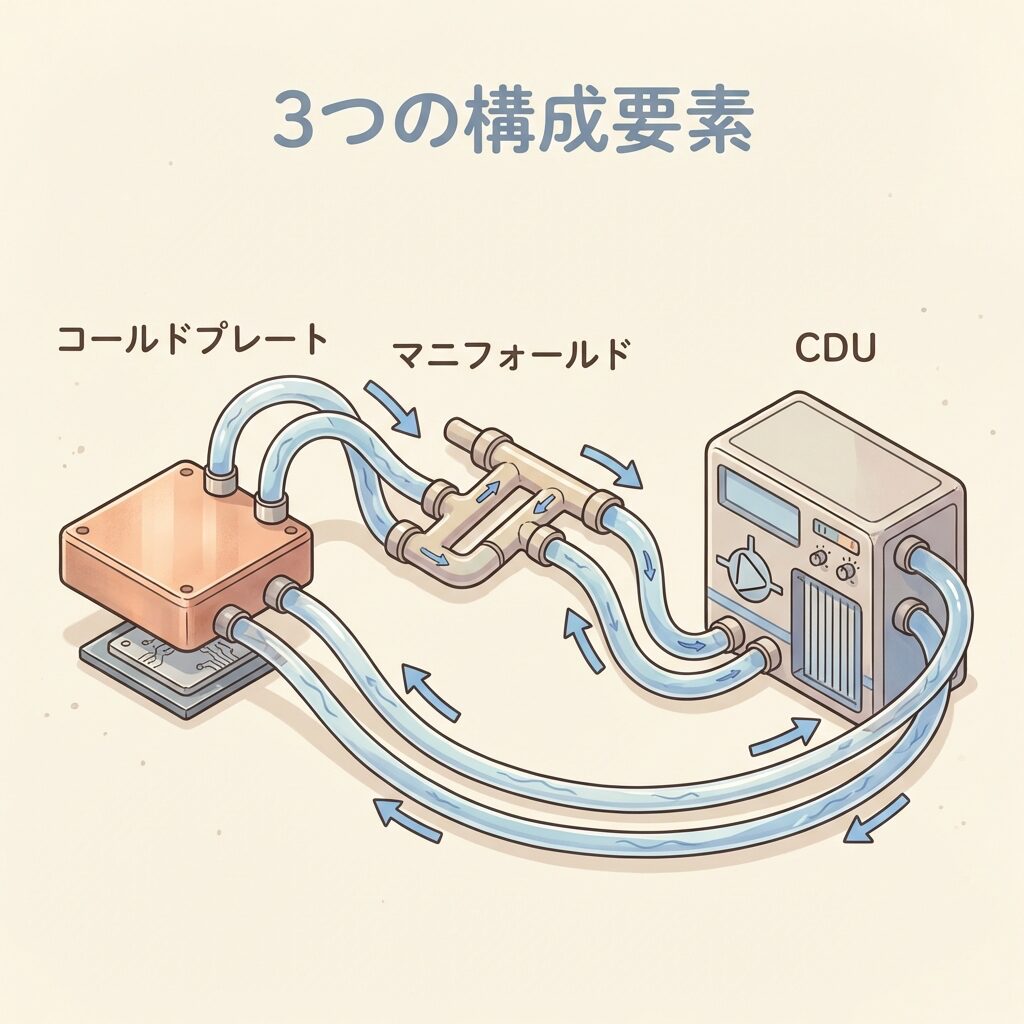 ② 3つの構成要素:コールドプレート(チップの熱を吸い取る接点)、マニフォールド(ラック内の分配パイプ)、CDU(冷却液の温度・流量を制御する心臓部)。