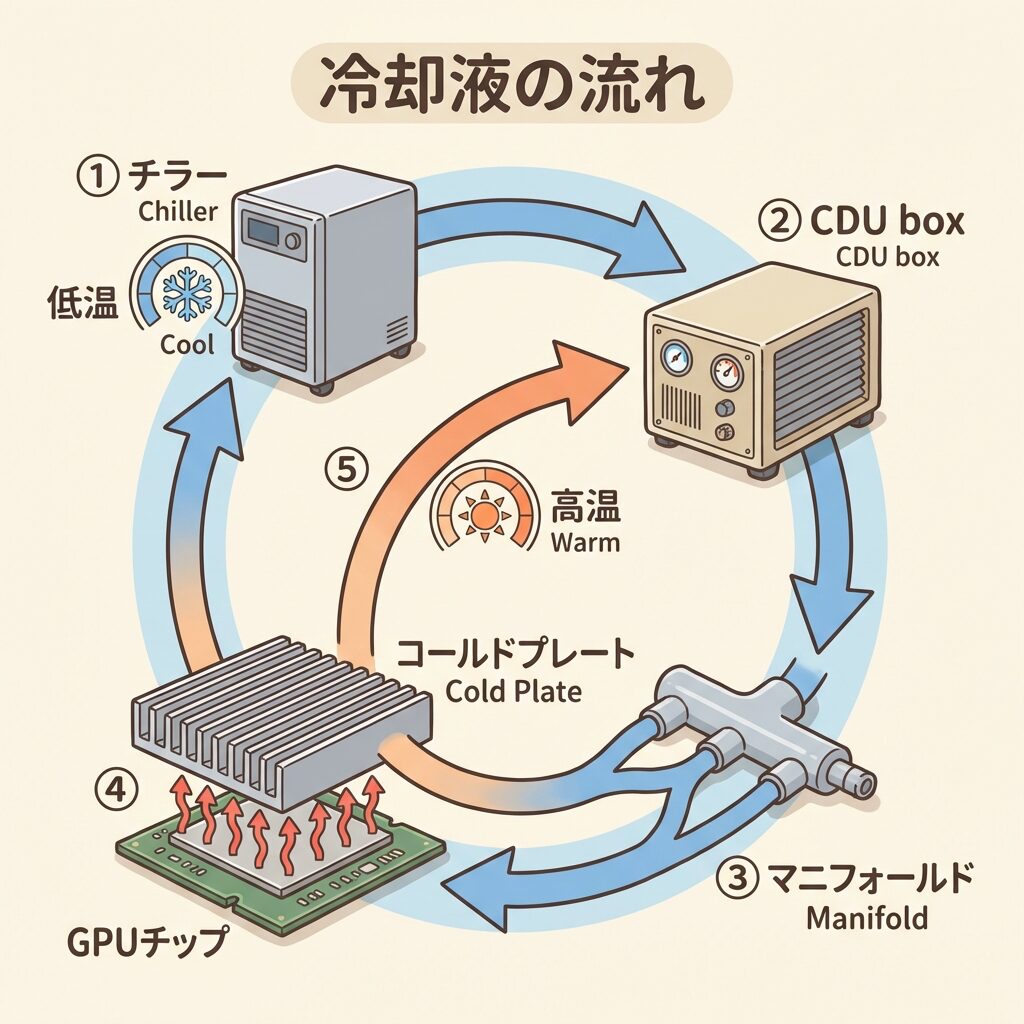 ③ 冷却液の流れ:チラー→CDU(一次側と二次側で熱交換)→マニフォールド→コールドプレート(チップの熱を吸収)→CDUに戻る、の循環。