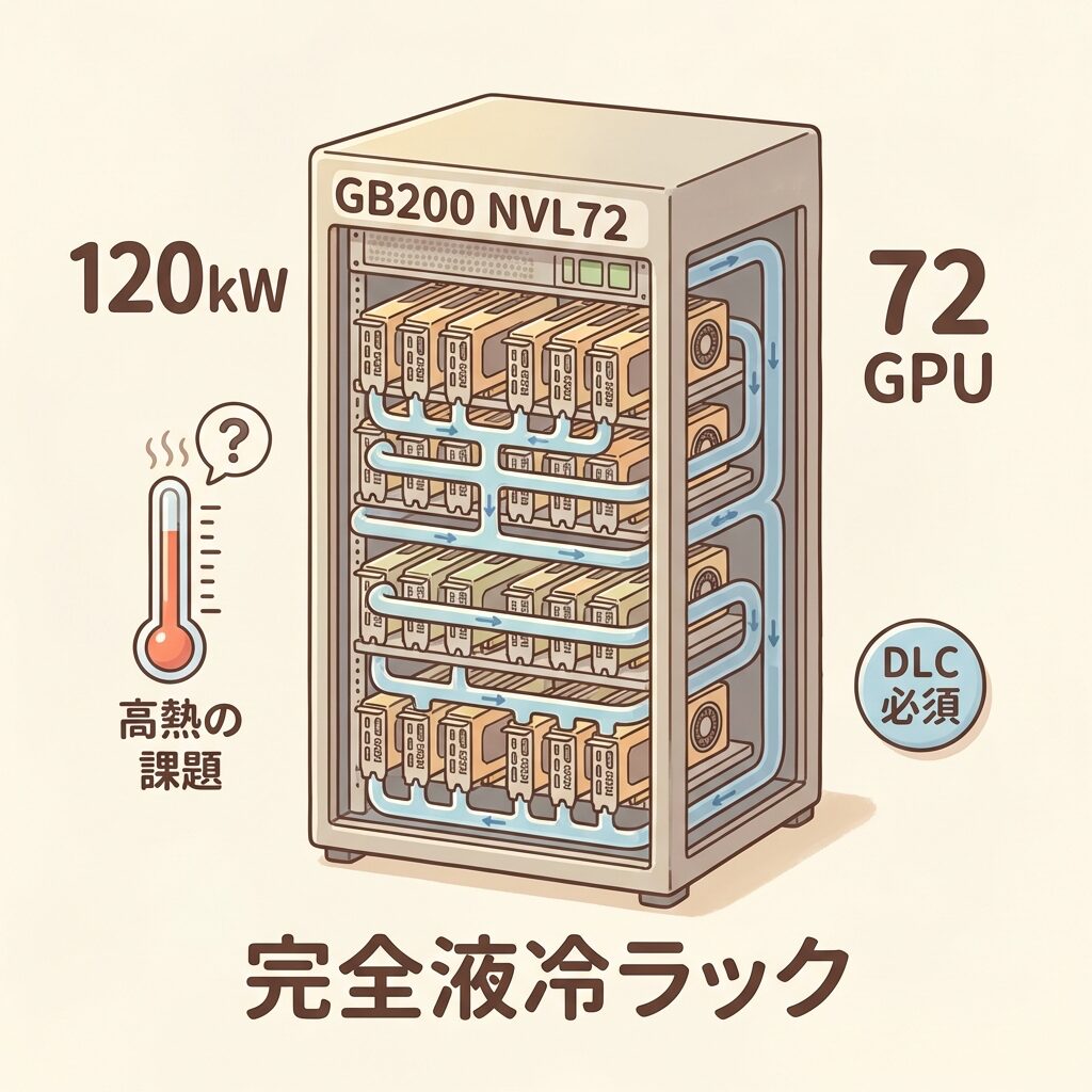 GB200 NVL72は「超高層マンション1棟分の電気を使う工場が、1つのラック(約2m×0.6mの棚)に収まっている」状態です。このラックが出す熱は電気ストーブ120台分。エアコン(空冷)で冷やそうとすれば台風レベルの風が必要──だから液体で直接冷やすDLCが「必須」なのです。