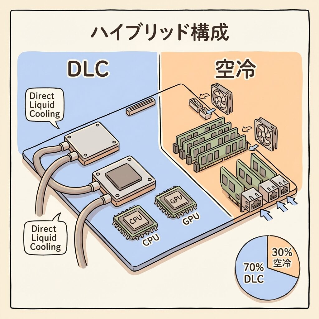 空冷が「扇風機で部屋全体を冷やす」なら、DLCは「氷水のパイプを熱いフライパンに直接押し当てる」方式です。熱源に直接触れるので、空気を介するより圧倒的に効率がいい。ただし、フライパン(チップ)以外の場所──テーブル(メモリ)や壁(ネットワーク機器)──は冷やせないので、そこは扇風機(空冷)も併用する。これが「ハイブリッド構成」です。