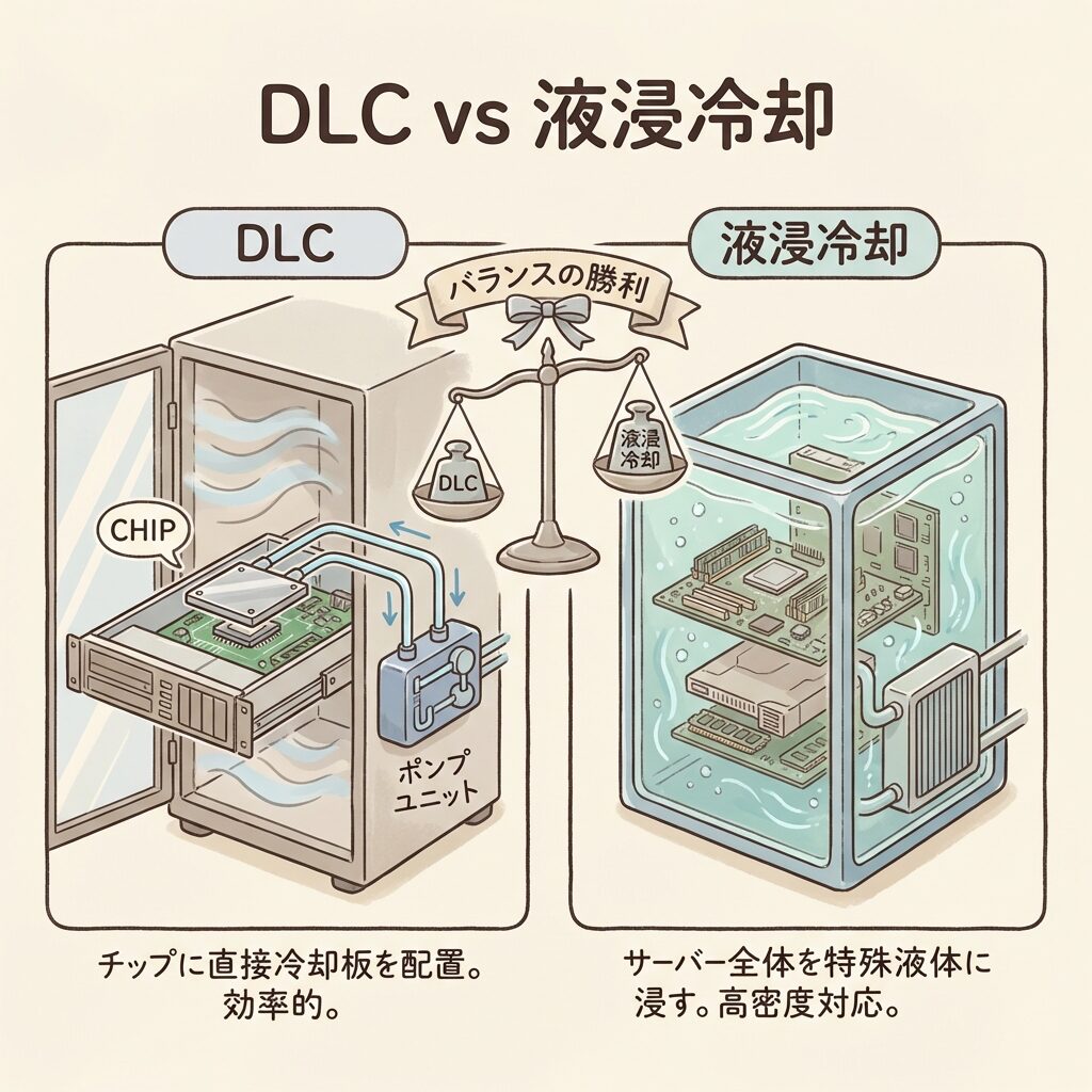 「DLCと液浸冷却、どっちが優れているの?」──答えは「用途による」です。以下の比較表で、両者のトレードオフを整理しましょう。