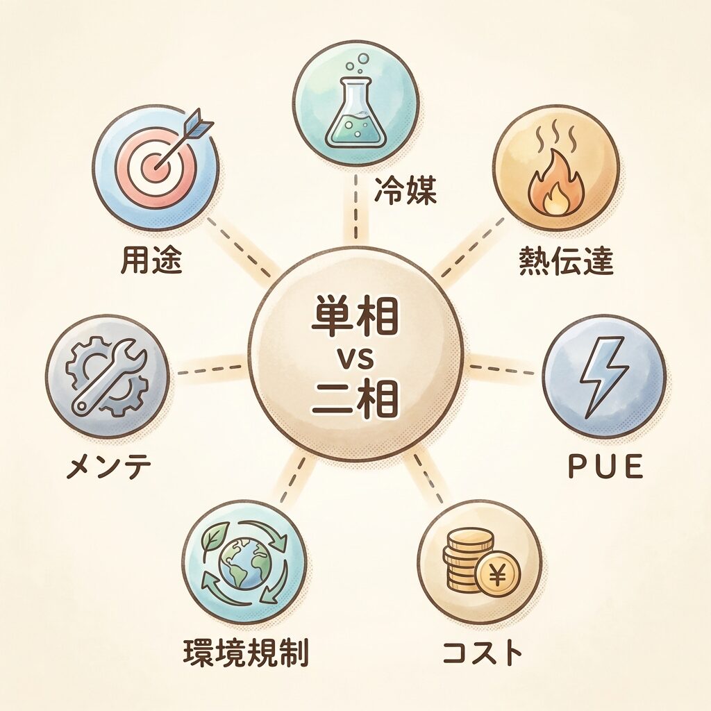 二相は熱伝達で圧倒的に優位(20〜100倍)ですが、コスト・環境規制・メンテナンスの3軸で単相に大きく劣ります。「性能は二相が上、総合的な導入しやすさは単相が上」──この構造を押さえれば、以下の各論がすんなり入ります。