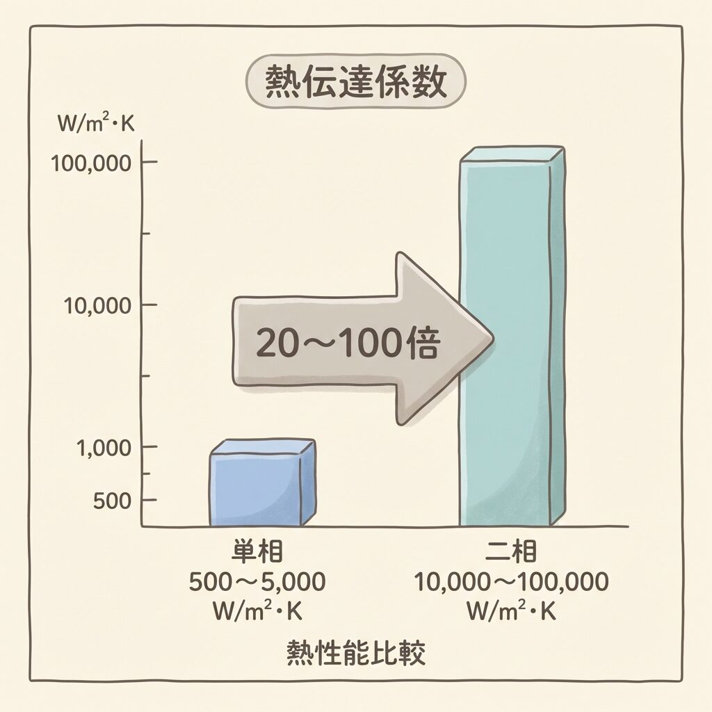 「単相」=1つの相(液体だけ)。「二相」=2つの相(液体と気体)を使う。名前の由来はこの「相の数」です。二相が強力なのは、液体が気体に変わるとき(沸騰)に莫大な熱を一気に吸収する(潜熱利用)から。同じ量の液体でも、温度を上げるだけ(単相)よりも、沸騰させた方(二相)がはるかに多くの熱を運べます。