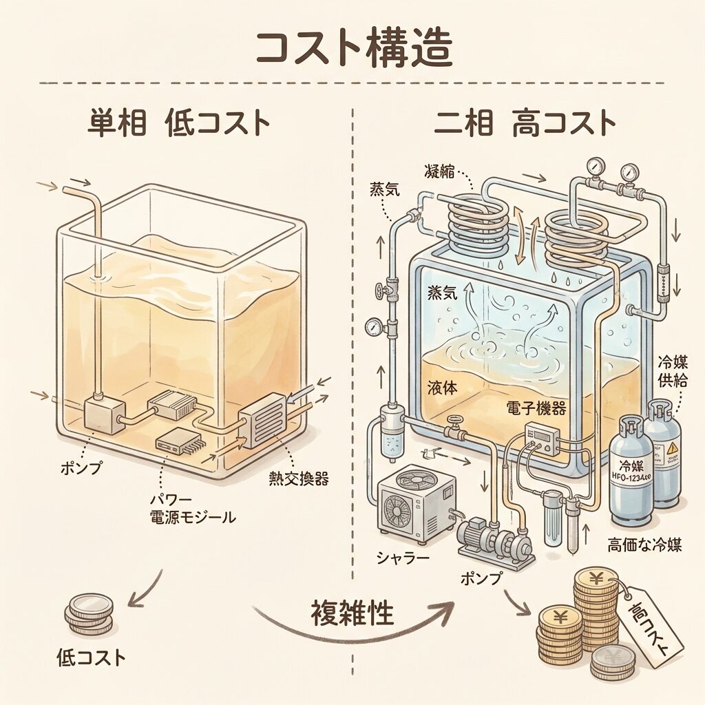 ⑤ コスト:二相の冷媒はオイル系より桁違いに高価。ライフサイクルコストで76〜90%の差が出る研究もある。