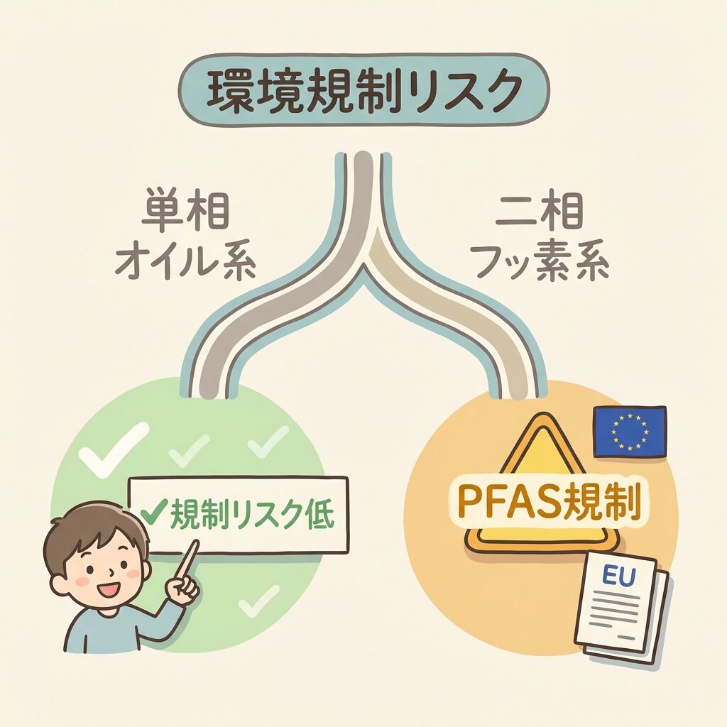 対照的に、単相液浸はPFAS非該当の鉱物油・合成油・植物油を使うため、この規制リスクとは基本的に無縁です。