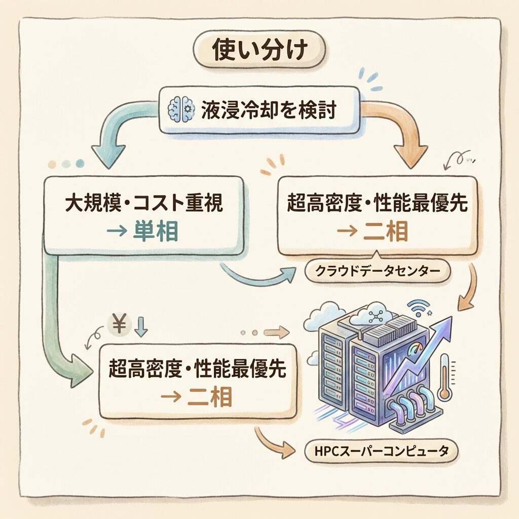 結局こういうことです。二相液浸は「冷却の物理性能」で単相を圧倒しますが、「コスト」「規制リスク」「メンテナンス」の3つの壁を抱えています。現在のAIデータセンターの液浸冷却市場では単相が実績と経済性で主流であり、二相は「将来の超高密度環境に向けた研究開発段階」というのが正確な位置づけです。どちらを選ぶかは「性能が欲しいか、運用しやすさが欲しいか」──用途と制約条件で決まります。