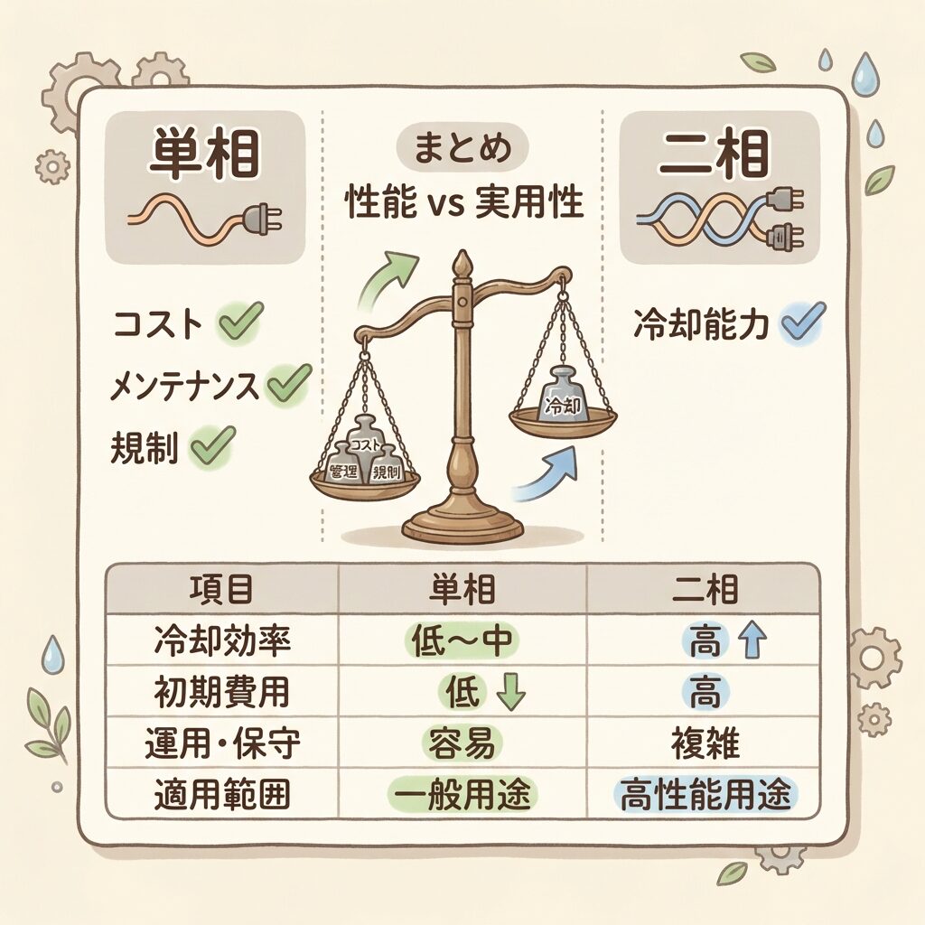 | 「二相のほうがすべてにおいて優れている」 | 熱伝達では圧倒的に上だが、コスト・環境規制・メンテナンスの3軸で単相が大幅に有利。「何を優先するか」で最適解が変わる。 |