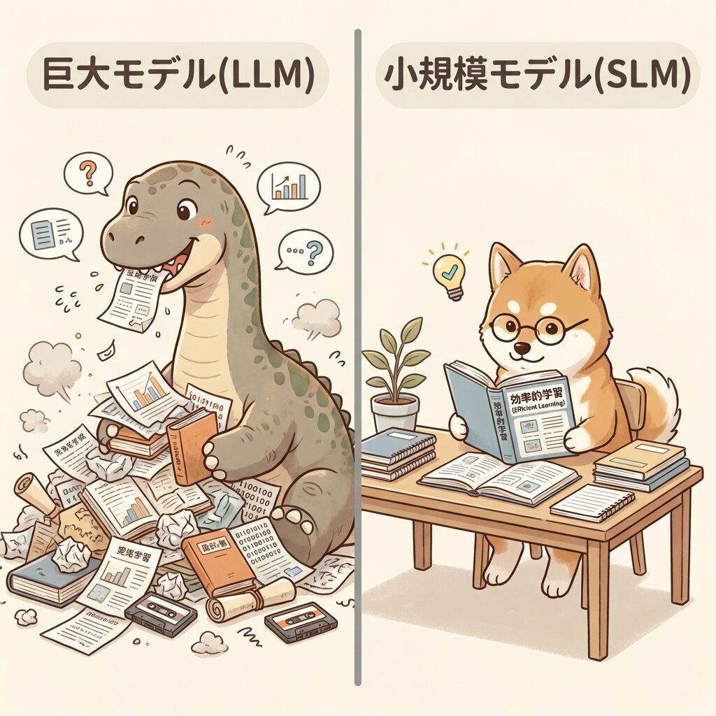 LLMは「図書館の本を端から端まで全部読んだ、頭でっかちな大人」。一方、SLMは「東大生が作った完璧な参考書だけを繰り返し勉強した、超優秀な小学生」です。知識の幅(雑学)では大人に負けますが、特定の問題を解く力(推論)は小学生でも互角以上に戦えます。