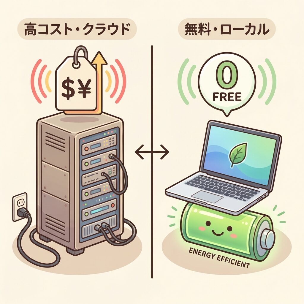 | コスト・遅延 | API利用料が高い。通信ラグあり | 無料(電気代のみ)。瞬時に反応 |