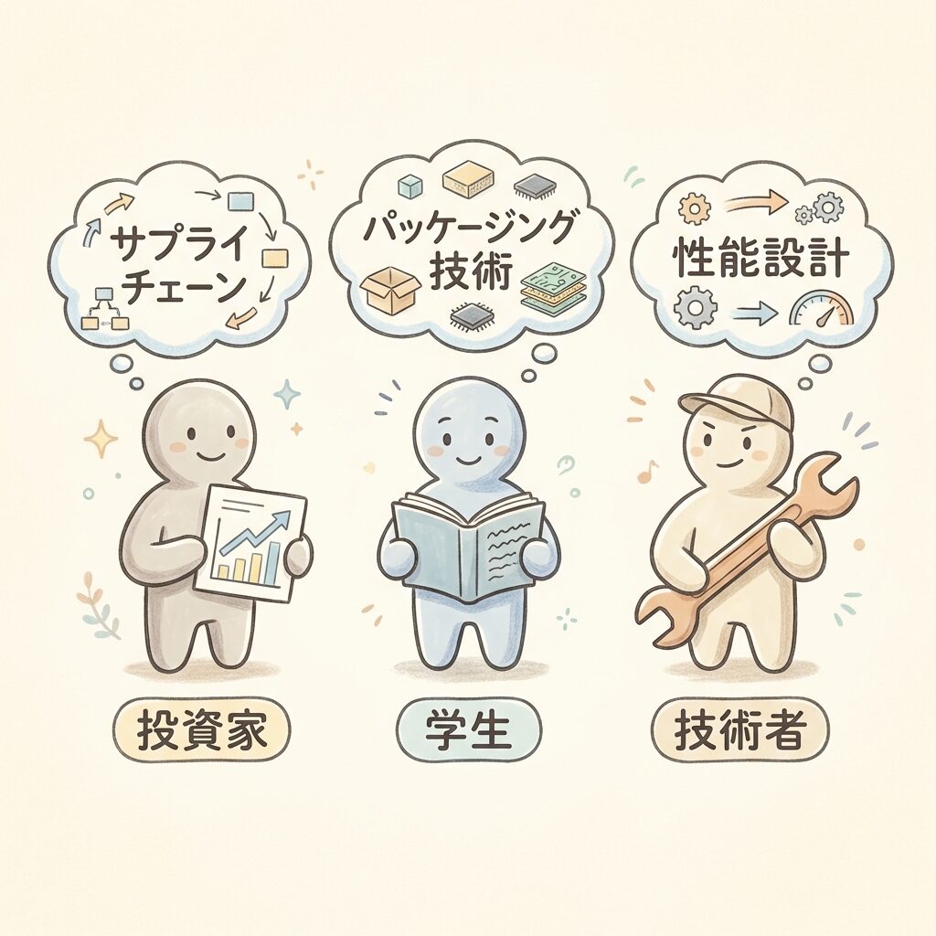 学生:TSV・先端パッケージング・2.5D/3D実装は、半導体エンジニアとして今後最も需要が高まるスキル領域です。「メモリアーキテクチャ」「チップレット設計」「先端パッケージング」を軸に学ぶと、就職・研究でのキャリアが広がります。情報系だけでなく、電気・材料・精密機械の学生にとっても参入余地が大きい分野です。