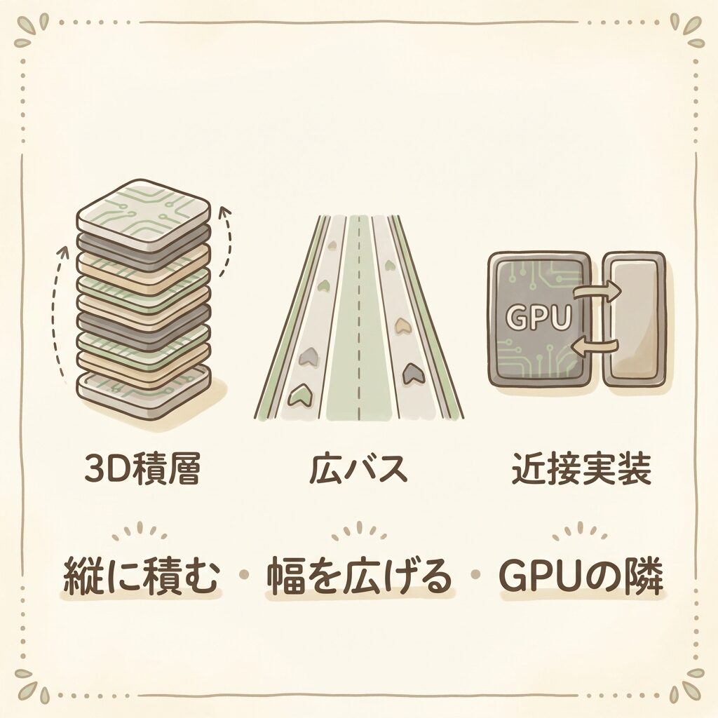 ③ 仕組み:DRAMを縦積み(3D積層)→TSVで貫通接続→インターポーザーでGPUの隣に近接配置(2.5D実装)。距離を縮め、帯域を広げる。