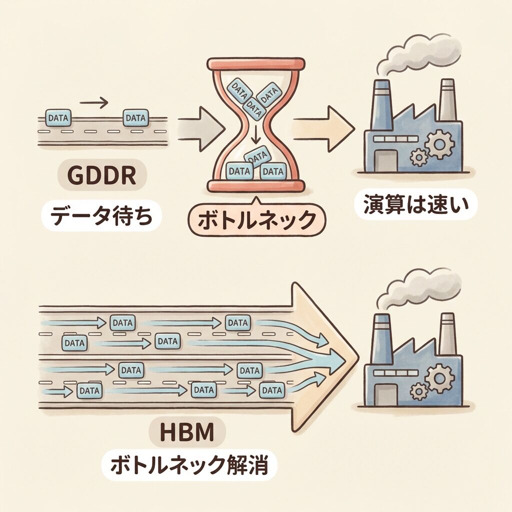 GPUは「毎分1万個のハンバーガーを作れる超高速工場」です。でも、食材を運ぶトラックが細い道路を1台で走るだけなら、工場はほとんどの時間を「食材待ち」に費やします。いくら工場が速くても、食材の搬入速度がボトルネックになるのです。HBMとは、その細道を「何十車線もある超広い高速道路」に変えるようなものです。